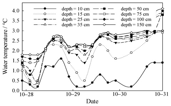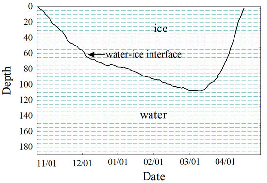 where λ is a substance’s thermal conductivity (W/(mK)); ρ is density (kg/m3); c is specific heat capacity (J/(kgK)); and ρc is the heat per unit of volume of a substance required to increase the temperature by 1 K. Under the circumstances where heat transfer among parts in a substance is not subject to relative displacements, the molecular thermal diffusivity under such specific conditions would be obtained when the λ substituted into the above formula is the molecular thermal conductivity of the substance. Conversely, the actual thermal diffusivity of icebound water, in which natural convection is involved, is called effective thermal diffusivity in this study. It can be obtained based on variations in the vertical profiles of water temperature within a fixed time frame (see Figure 2), even though direct calculation through Equation (5) would be in vain.