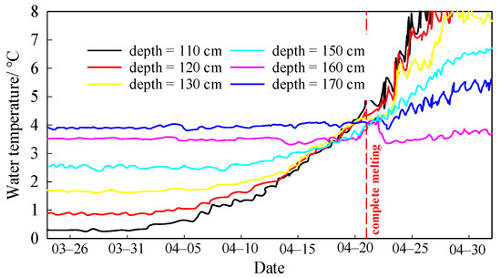 For the late winter, the intensified solar radiation caused by rising temperatures penetrated through the ice cover into the water body. The variations were complex in the vertical distribution of the water temperature, which specifically featured three layers [38]. The range from the ice-water freezing front to 5–10 cm downward is the conduction layer (CL), where the water temperature rises rapidly with increasing depth and the temperature gradient stands at 20–40 K/m. Beneath the CL is the mixed layer (ML), where water temperature is uniformly distributed vertically. The reason is that the intensified solar radiation during the late winter increases the temperature and density heterogeneity among the different layers of water. The resulting natural convection driven by buoyancy facilitates heat exchange and mass transfer between the upper and lower layers, leading to the uniform distribution of a vertical water temperature [39]. The hypolimnion beneath the ML constitutes the quiescent layer (QL), in which the water temperature is linearly distributed in a stable state since influences imposed by solar radiation on the water body are minimized by the great depth. Figure 6c displays that water temperature, particularly in the CL and ML, displaying an overall increase overtime during the late winter. Variations in the thickness of the ML and QL appeared significantly, while the temperature gradient of the CL widened constantly. For instance, the water temperature of the ML on the fringe of the CL rose by about 1.9 K between 30 March and 10 April. The thickness of the CL remained unchanged, whereas that of the ML increased from 14 to 61 cm, which accounted for over two thirds of the icebound water. The temperature gradient of the CL rose from 40 to 64 K/m over time. In contrast, the gradient of the QL remained at around 4 K/m.