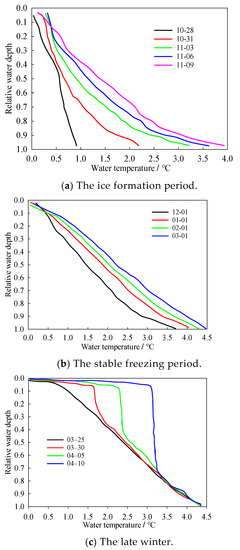 Epilimnion differed from hypolimnion in phases induced by changes in water temperature, generating vertical spatial differences in temperature. Meanwhile, temporal differences also existed in the vertical distribution of water temperature during different periods of ice coverage due to variations in meteorological factors and ice thickness. The duration of ice coverage in this research comprised three periods. The first was the initial stage of ice formation, which lasted from the formation of ice cover on the lake’s surface to the moment of ice cover reaching 30 cm in thickness. Stable freezing, the second period, commenced when the ice thickness exceeded 30 cm and ended once constant melting of the ice cover begun. Lastly, the late winter spanned from the end of the second period to the complete disappearance of the ice cover. Figure 6 shows vertical profiles of the water temperature during the three periods of the ice-cover duration, in which observational data on water temperature were acquired at 10 a.m. every day. It should be noted that since the ice thickness changed over time, and the icebound water depth was also time-varying, the relative water depth (ratio of local depth and maximum water depth) was adopted for convenience and for consistency in the analysis.
