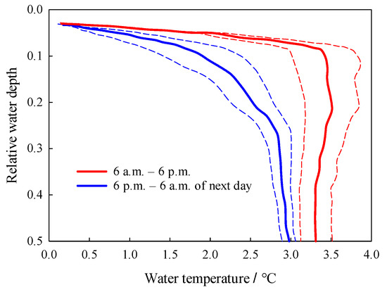 Figure 7 demonstrates diurnal variations in the vertical distribution of the average water temperature on 6 and 7 April during the late winter, and the parts between the dotted and solid lines in this figure represent the standard deviations of the average water temperature. The diurnal variations in the thickness of water layers were considerably small. The average water temperature in the daytime was evidently higher than that in the nighttime, while the maximum variation in the diurnal temperature, which stood at 1.4 °C, occurred in the transitional zone between the CL and the ML. The temperature gradient of the CL in the daytime was around twice that at nighttime. The standard deviation of the daytime water temperature was obviously higher than that of the nighttime at a given depth, indicating that fluctuations in daytime temperatures were more drastic than in nighttime temperatures.