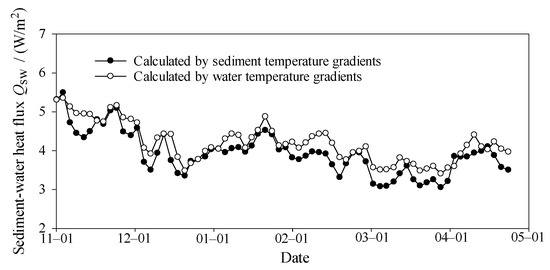 Figure 8 displays the temporal variations in sediment-water heat flux calculated through Equations (1) and (3) based on observational temperature data. As a comparison, Figure 8 shows the heat fluxes calculated by using both sediment temperature gradients and water temperature gradients. It can be seen from the figure that the two kinds of results both show that the sediment–water heat flux throughout the whole freezing duration remained as a positive value, implying that the sediment was releasing heat into the water. The sediment–water heat fluxes calculated using water temperature gradients are distributed in the range 3.4~5.3 W/m2, and the average value is 4.1 W/m2 during the whole freezing period, while the fluxes calculated by sediment temperature gradients are distributed in the range 3.5~4.6 W/m2, with an average of 3.8 W/m2. The average value calculated using the water temperature gradient is slightly larger than that by sediment temperature gradient, and the difference is 0.3 W/m2, which is equivalent to 7.3 and 7.9% of them, respectively.