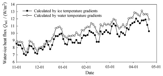 Figure 9 demonstrates the temporal variations in water–ice heat flux at the water-ice interface calculated through Equation (4) based on the observational data temperature. As a comparison, Figure 9 also shows the heat fluxes calculated by using both ice temperature gradients and water temperature gradients. It can be seen from the figure that the two kinds of results both show that the water–ice heat flux throughout the whole freezing duration remained as a positive value, indicating that the water body was emitting heat into the ice cover. In addition, the two results both show the rising trend as time passed. The water–ice heat fluxes calculated using the water temperature gradients are distributed in the range 7.3–13.1 W/m2, and the average value is 10.3 W/m2 during the whole freezing period, while the fluxes calculated by ice temperature gradients are distributed in the range 6.9–12.1 W/m2, with an average of 9.8 W/m2. The average heat flux calculated using the water temperature gradient is also larger than that using the ice temperature gradient, and the difference is 0.5 W/m2, which is equivalent to 4.7 and 5.1% of them, respectively. The average value of water–ice heat flux, 9.8 or 10.3 W/m2, is greater than some results obtained in studies on deep lakes [40,41] (5–7 W/m2). Therefore, the calculation of ice thickness in a shallow lake would be far from reasonable if the water–ice heat transfer was neglected and the lower boundary of the ice cover was regarded as thermally isolated or observed values of the water–ice heat flux from a deep lake were adopted.