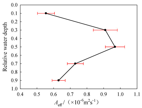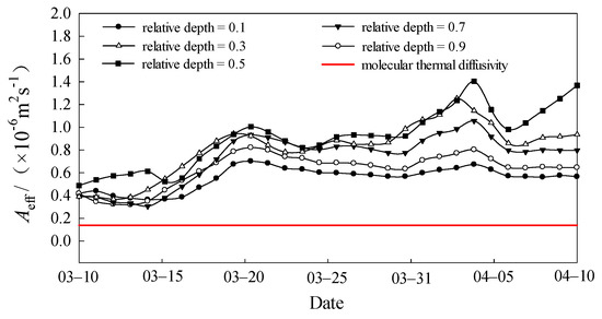 Figure 10 presents the calculated values of effective thermal diffusivity Aeff varied with water depths and time. It shows that the Aeff in water during the late winter was in the range of 0.32–1.37 × 10−6 m2/s, which was 2.3–9.8 times the molecular thermal diffusivity, amounting to 0.14 × 10−6 m2/s. Aeff varied with the position of relative water depth (Figure 10). Figure 11 is drawn based on the time-averaged values of Aeff at different water depths in late winter. It displays that the average value of Aeff in this period first increased and then decreased with relative water depth. The Aeff value in the middle relative depth was significantly larger, and the maximum value, 0.97 × 10−6 m2/s, occurred approximately at the relative depth of 0.5. It indicated that the water temperature in the mixed layer area tended to be more uniformly distributed since the natural convection there proved to be more drastic and water temperature spread more quickly between the different layers. In contrast, the water near the freezing front (conduction layer) and near sediment (quiescent layer) had larger vertical temperature gradients and the temperatures were more inhomogeneously distributed in comparison to the mixed layer, due to the small effective thermal diffusivities and slow spread of water temperature.
