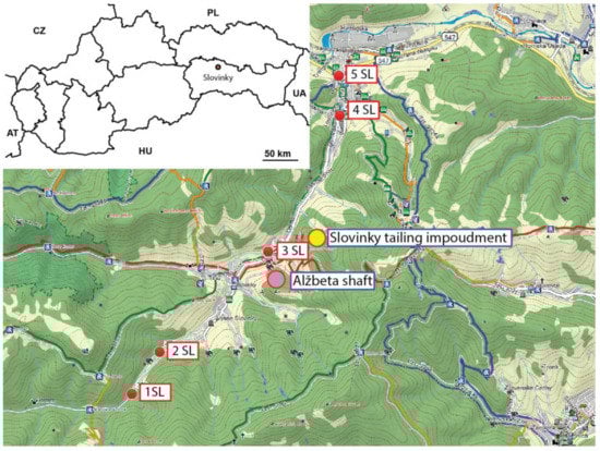 The current study was carried out in an area that was intensively influenced by mining activities for a long time. The studied area of Slovinky is a significant ore area with rich deposits of copper and silver ores, the subject of extraction for centuries. After the decline of mining focused on copper ores, the mining industry in Slovinky was redirected to the extraction of iron ores in the second half of the 19th century. One of the most significant remains of the mining activities in this area is the Slovinky tailing impoundment. The tailing impoundment has an area of 15 ha, and the height of its dyke is 113 m above sea level, which puts the tailing impoundment among the highest water structures in Slovakia. The surface of the tailing impoundment consists of a solid-consistency material that has been formed by the gradual evaporation of water from the liquid mud that was transported to the tailing impoundment. Towards the bedrock, there are liquid sand and water. The mud of the tailing impoundment contains elements of gold, silver, iron, copper, arsenic, and other metals. The tailing impoundment poses a threat to the environment for several reasons. At the sludge bed, dust particles are transmitted, which are transported over long distances, thereby reducing air quality and transferring toxic elements. Soaks of the contaminants into the groundwater are also dangerous. In the village of Slovinky and its surroundings, there are seven other tailing impoundments, which, due to the unsatisfactory state of the dam and drainage system, pose a threat, especially during torrential rains [].