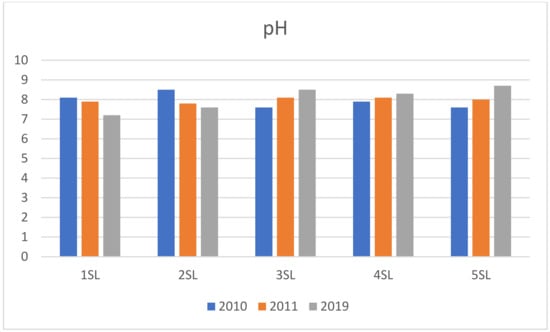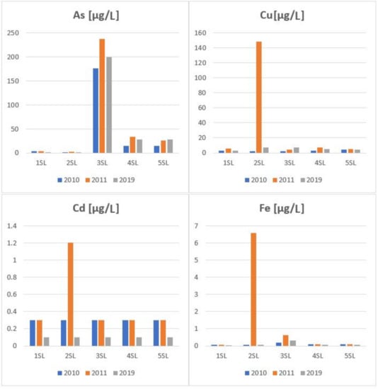 In addition to the above parameters, we also monitored the pH of the water samples as one of the most important parameters influencing metal content in a bioaccessible form in the environment []. Act No. 269/2010 Coll. [] sets a pH limit value in the range of 6 to 8.5. In the monitored years of 2010, 2011, and 2019, the water at most sampling points complied with the requirements set by the law, with the exception of 2019 at the 5SL site (pH 8.7). In the mining water represented by the outflow of drainage water from the sludge pond and from the shaft, the pH value reached 7.37 to 7.55 (Figure 5); at the same time, the sludge pond material had an alkaline character; this appears to be consistent with the study by Al-Abed et al. [].