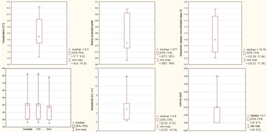 Physical–chemical parameters (pH, temperature, dissolved oxygen concentration, conductivity, resistivity, salinity, and total dissolved solids) were monitored directly at the sampling points and evaluated using a WTW Multi 3410 SET 4 instrument (WTW Xylem Analytics Group, Weilheim, Germany). Using a Eutech CyberScan PC650 multimeter (Singapore), we measured the amount of NaCl in the water. The redox potential was measured by a METTLER TOLEDO instrument (Mettler-Toledo Group, Greifensee, Switzerland) with an InLab Redox electrode in the laboratory within 24 h of sampling.