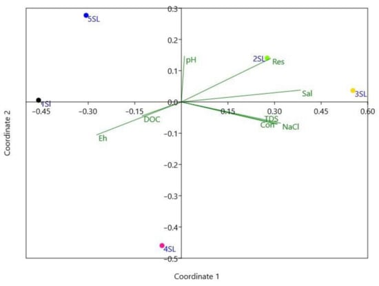 Graphic output of the NMDS ordination displaying localities and significant environmental vectors. (Notes: DOC—dissolved oxygen concentration, Con—conductivity, Res—resistivity, Sal—salinity, TDS—total dissolved solids, Eh—redox potential, 1SL–5SL—sampling sites).