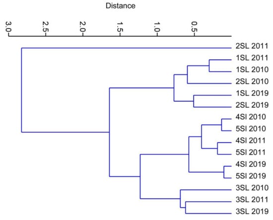 Dendrogram derived from the hierarchical cluster analysis (HCA) of risk elements in the water samples, in relation to time and space, of the Slovinský creek (Slovakia).