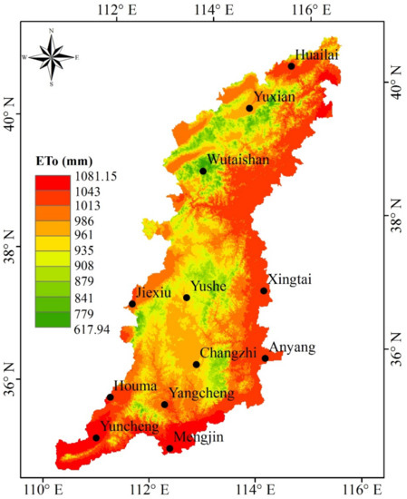 The spatial distribution of the mean annual ETo plotted in Figure 2 was estimated by the FAO-56 PM equation using the monthly meteorological gridded data from 1973 to 2016. The mean annual ETo gradually increased from the western highland to the eastern plain across the whole THM, ranging from 617.9 to 1081.1 mm. Accordingly, the lowest value was observed at Wutaishan station (715.1 mm), and the highest ETo occurred at Yuncheng station (1135.1 mm) (Table 1).