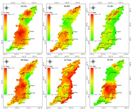 Trends of the five climatic factors displayed distinct zonal patterns (Figure 3b–f). RH in the north and southwest regions showed positive trends, while the central and southeastern plain areas exhibited negative trends (Figure 3b). Although SD exhibited a decreasing trend across almost the entire THM, a patchy appearance with increasing trend was found in the western region (Figure 3c). The overall increasing trend of Tmax across the whole THM bore a superficial resemblance to a topographic map of THM with a low Z value in the eastern plain and high Z value in the western highland (Figure 3d). Increasing trends of Tmin were detected throughout the whole area (Figure 3e). WS exhibited an obvious zonal pattern with growing trends in the central part of the north region and the south region. In contrast the decreasing trends of WS could be found in the southernmost and northernmost regions (Figure 3f). For the 12 meteorological stations, decreasing trends of RH were found at 91.7% of the stations (i.e., 11 of all (12) stations) and 58.3% of the stations (i.e., 7 stations) exhibited a significant decreasing trend (p < 0.05) (Figure 4b). SD significantly decreased at two-thirds of the stations (i.e., 8 stations, including 58.3% (7), p < 0.001 and 1 station, p < 0.05) (Figure 4c). Increasing trends of Tmax occurred at all the stations, with 58.8% of all stations (i.e., 7 stations) passing the 0.001 significance level and 2 stations giving the 0.05 significance level (Figure 4d). Tmin increased significantly at all the stations (p < 0.001), except Yushe station with insignificant increasing trend (Figure 4e). The decreasing WS was found at 58.3% of all the stations (i.e., 7 stations), of which 6 stations (i.e., half of all the stations) were statistically significant (p < 0.05) (Figure 4f).