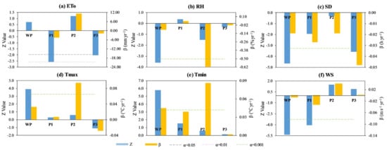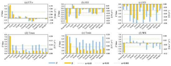 Z values and change rates (β) of climatic factors at 12 meteorological stations and the whole THM during 1973–2016: (a) ETo; (b) RH;(c) SD; (d) Tmax; (e) Tmin; (f) WS.