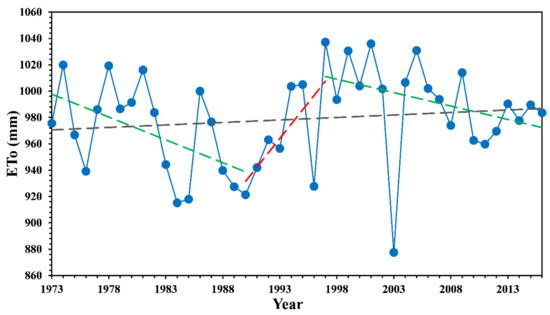 Variation in annual ETo and change-points in the ETo series during 1973–2016. (The gray dashed line represents the trend of ETo during the whole study period. The red and green dashed lines represent the upward trends and downward trends of ETo during the subperiods, respectively).