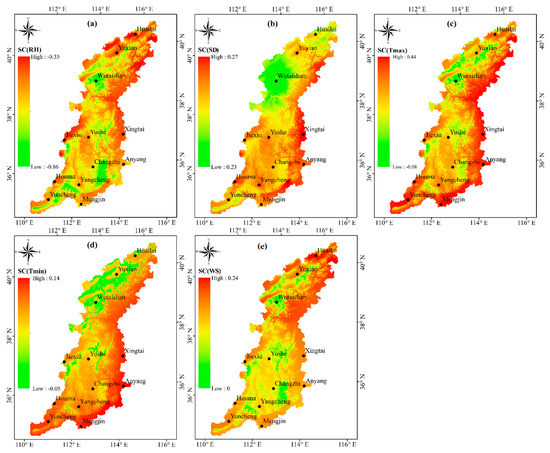 The spatial distributions of the sensitivity coefficients of climatic factors during 1973–2016. (a) SC(RH), (b) SC(SD), (c) SC(Tmax), (d) SC(Tmin), (e) SC(WS).
