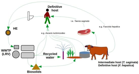If recycled water is not treated adequately, its use in agriculture may lead to human- and livestock-helminthiasis (Figure 1). Helminthiasis is the term describing human and animal diseases caused by infections of parasitic worms (e.g., tapeworms, whipworms or roundworms). The eggs of some of the most common helminth species (e.g., Ascaris, Trichuris, Ancylostoma, Necator americanus) typically require a period of soil conditioning to become infective. These are the soil-transmitted helminths (STHs). The WHO estimates that around 1.5 billion people are infected with soil-transmitted helminths [5]. The infection is widely distributed, with the greatest numbers occurring in sub-Saharan Africa, the Americas and Asia. More than 100 countries are endemic for STH infections [6]. Where sewerage systems exist, WWTPs provide a barrier to the transmission of the eggs, thus preventing completion of the helminth lifecycle (Figure 1).