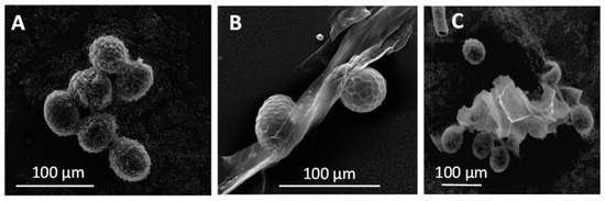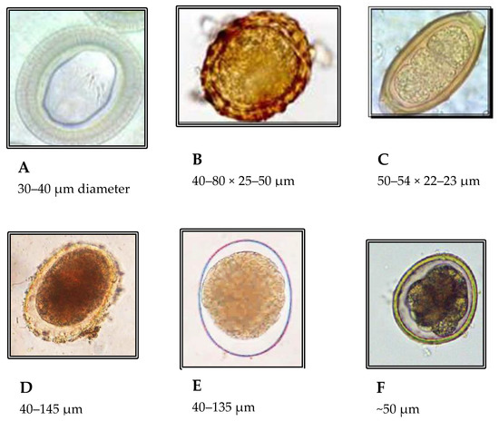 Electron micrograph images of Taenia spp. egg (A) [62], Ascaris lumbricoides egg (B) [70], Trichuris trichiura egg (C) [70], plant pod (D) [71], insect or spore ova (E) [71], Toxocara cati egg (F) [72].