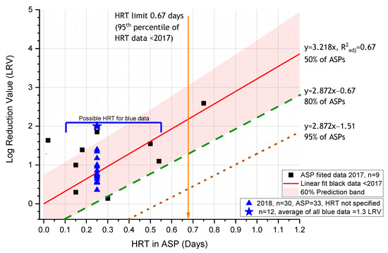 Log reduction value (LRV) design equation proposed for Activated Sludge Plants (ASPs). The green long-dashed line represents what 80% of ASPs would achieve (i.e., the lower 60% Prediction band) and is proposed for ASPs with a high level of design and management; data from [12]). The LRV equation for 95% of ASPs (red short-dashed line) was the removal equation originally proposed [12]. Blue data points are from the 2018 publications. Hydraulic retention time (HRT) limits are discussed in the text.