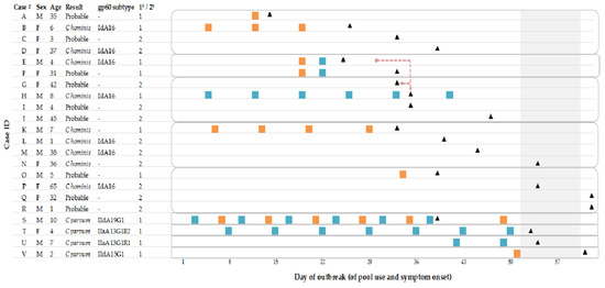 Microbiological and environmental findings of the investigation were summarized descriptively. We described the epidemiology of the cases by time, place, and person (date of onset of symptoms, dates/times of pool use, age and sex distribution, and cryptosporidium microbiology) using the following case definitions: