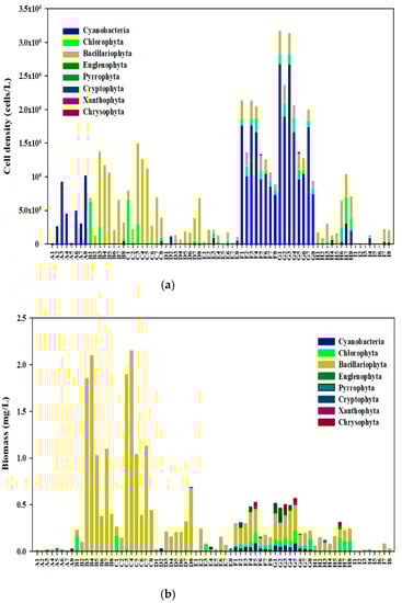 A 100 mL water sample was fixed with Lugol’s solution and preserved for phytoplankton counting. The species of phytoplankton were identified and counted using an inverted microscope. After the concentrated sample was shaken evenly, 0.1 mL was taken, and added to a 0.1 mL counting box. A 22 mm × 22 mm cover glass was used. The number of algal cells was determined through observation in 100 fields of vision. For each species, the cell size, i.e., volume, was estimated based on the cell morphology and direct measurement of the main cell dimensions in more than 25 randomly selected individuals. When size differences were observed within a species, the individuals of that species were divided into several cell sizes to determine the cell volume. The biomass of each species was calculated assuming a wet weight density of 1 g·cm−3 (abundance × cell volume) [], and the total biomass of phytoplankton was calculated as the total biomass of all present species.