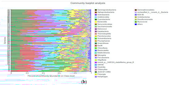 After sequencing 72 samples of bacterioplankton from Qingcaosha Reservoir in 2019, a total of 6827 OTUs were detected, which were distributed in 57 phyla, 161 classes, 408 orders, 654 families, 1238 genera, and 2543 species. At the phylum level (Figure 3), the relative abundance of Proteobacteria in the sampling period was higher than 10%, reaching a maximum of 79.49% in July. The relative abundance of Actinobacteria fluctuated from 5.62% to 58.03%. At the class level (Figure 3), the relative abundance of Gammaproteobacteria was higher than 3% during the sampling period, reaching a maximum of 56.81% in July. The relative abundance of Actinobacteria fluctuated in the range of 2.57–42.57%, and showed a decreasing trend from April to December. The relative abundance of Cyanobacteria fluctuated from 0.21% to 55.35%, and the abundance gradually increased from April to December.