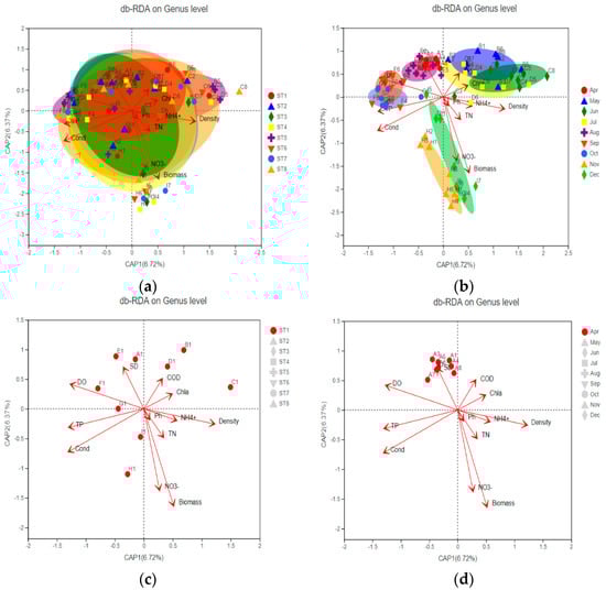 The bacterial community and environmental factors were analyzed by db-RDA (based on the Bray-curtis distance). Figure 6 shows that the spatial and temporal effects of environmental factors on bacterial community structure were varied. Figure 6d shows that the bacterioplankton abundance (genus level) was positively correlated with SD and DO in April and August, and negatively correlated with TN, NO3−-N, and algal biomass. The bacterioplankton abundance (genus level) was positively correlated with TN, NO3−-N, and algae biomass in November and December, and negatively correlated with SD and DO. The bacterioplankton abundance (genus level) was positively correlated with DO, TP, and Cond, and negatively correlated with COD, Chl-a, NH4+-N, and algal density in September and October Figure 6b. In May, June, and July, they were positively correlated with COD, Chl-a, NH4+-N, and algal density, and negatively correlated with DO, TP, and Cond.