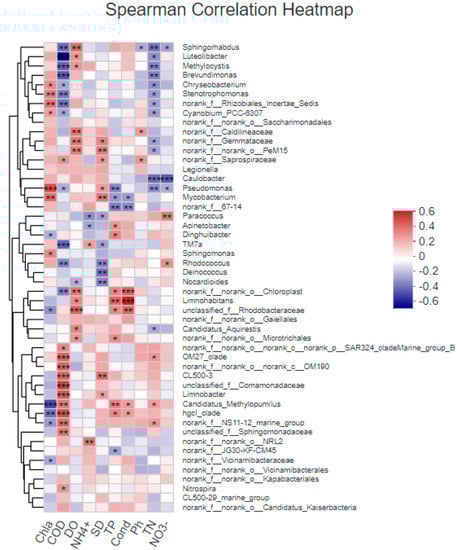 To further explore the relationship between bacterioplankton and environmental factors, the Spearman correlation analysis was used to calculate the correlation between environmental factors and bacterioplankton abundance (genus level) (Figure 7). The results show that Pseudomonadales was positively correlated with Chl-a, and Candidatus_Methylopumilus was negatively correlated with Chl-a. OM27_clade, OM190, CL500-3, unclassified_f_Comamonadaceae, and Limnobacter were positively correlated with COD, while Luteolibacter, Methylocystis, Brevundimonas, and TM7a were negatively correlated with COD. Unclassified_f_Rhodobacteraceae was positively correlated with DO. norank_f_norank_o_NRL2 was positively correlated with NH4+-N. CL500-3, Mycobacterium and PeM15 were positively correlated with SD, while Rhodococcus, Deinococcus, and Nocardioides were negatively correlated with SD. Limnohabitans and Candidatus_Methylopumilus were positively correlated with TP, and Pseudomonadales was negatively correlated with TP. Chloroplast and Limnohabitans were positively correlated with Cond. Caulobacter, Sphingomonadacea, Methylocystis, and Brevundimonas were negatively correlated with TN. Paracoccus was positively correlated with NO3−-N, which was negatively correlated with Caulobacteraceae.