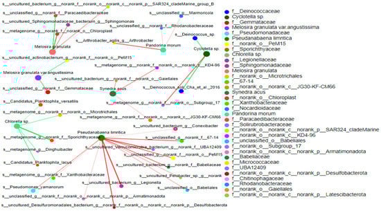 The coexistence relationship between bacterioplankton and phytoplankton in the non-salt tide period of the reservoir area was obtained by two-factor analysis. The interaction between in the top 500 bacterioplankton in terms of abundance and top 15 phytoplankton in terms of dominance was analyzed (Figure 8). The results show that Pseudanabaena sp. was positively correlated with Legionella, PeM15, Desulfobacterota, and UBA12409. Synedra acus was positively correlated with KD4-96. Pandorina morum was positively correlated with Arthrobacter. Cyclotella sp. was positively correlated with Subgroup_17 and negatively correlated with Deinococcus_sp. Melosira granulata was positively correlated with Sphingomonas. Melosira granulata var. angustissima was negatively correlated with Gemmataceae. Chlamydomonas was negatively correlated with Sporichthyaceae and Microtrichales.