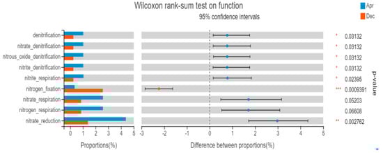 Test results for functional group differences (April and December). The X-axis represents the function name, the Y-axis represents the percentage value of a function abundance of the sample, and different colors represent different groups. * 0.01 < p ≤ 0.05, ** 0.001 < p ≤ 0.01, *** p ≤ 0.001.