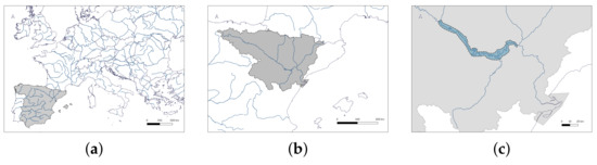 Location of Spain in Europe (a); location of the Ebro River basin in Spain (b) and location of the computational domain of the study in the basin (c).