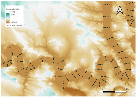 The 1D mesh was generated from topographic information of the field compound by 433 cross sections. Among them, 100 sections are within the reservoir region (as in example in Figure 5). The lateral span of the sections must capture the shape of the river bed to avoid losing information relevant to the evolution of the variables but avoiding overlapping. It is of vital importance that the sections are always normal to the river in curved regions, as seen in Figure 5. Finally, a 1D mesh of 2000 cells is obtained. Additionally, a uniform roughness coefficient n = 0.032 is chosen ([33]). A steady flow with a discharge value that matches the value at the initial time of the inlet hydrograph is set as initial condition. The upstream boundary condition is a hydrograph, while the downstream boundary condition is a spillway condition, which represents the presence of the Mequinenza dam.