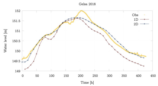 Figure 9 shows the 2018 inlet hydrograph used as upstream boundary condition. Figure 10 displays the discharge time evolution as computed with the 1D and the 2D models together with the observation at Gelsa (A263) gauging station (upper) and Mequinenza dam (E003) (lower) for this event. The time evolution of the surface water level at Villafranca gauging station (the only measured variable) is displayed in Figure 11. The evolution of the water levels predicted by the two models is again quite similar to that of the real data until approximately h. Around this time, the measured data suffer a slight decrease not predicted by the 2D model.