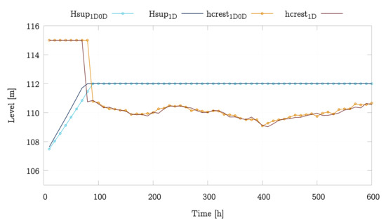 The temporal evolution of the water level at x can be seen in Figure 13. Although there is a very good agreement, the figure shows that the level of the 1D-0D model is slightly below the value of the full model at that location (x). This is because there is not a uniform level in the entire reservoir and the 1D model represents this behaviour. However, the 0D model assumes a constant level in the reservoir that matches quite exactly the level at the end of the reservoir in the 1D model (x). In addition, the lag previously obtained by the model 1D-0D is no longer present. The reservoir surface area function, , corresponds to the entire reservoir. However, as part of the reservoir is being discretised by the 1D model, the boundary condition of the 1D-0D model causes a slower evolution of the level, as it is considering that there is a larger modeled reservoir than there should be and, therefore, it overestimates the value of .