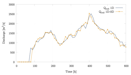 The comparison between the full 1D model and the 1D-0D model is next carried out for the 2015 flood event. The discretisation of the full 1D model is the same used in the former subsection, while the 1D-0D model is characterised by a partial discretisation of the domain embedding the reservoir zone within the outlet boundary condition. In this last case, only the first 352 sections and 1511 mesh cells are necessary for the discretised part. This is, following Figure 4, for the river reach from x = 0 to x = L’.