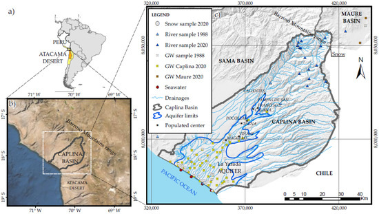 Location of the study area. (a) Atacama Desert in Chile and Peru, (b) Barroso Mountain range, a separation boundary between Caplina and Maure basins, (c) La Yarada coastal aquifer in the Caplina basin.