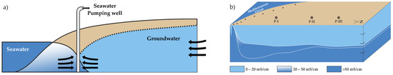 (a) Conceptual model of the negative effect on the hydraulic barriers, modified after [31] and (b) geometry of the freshwater–seawater contact, predicted from the mixing model [32].