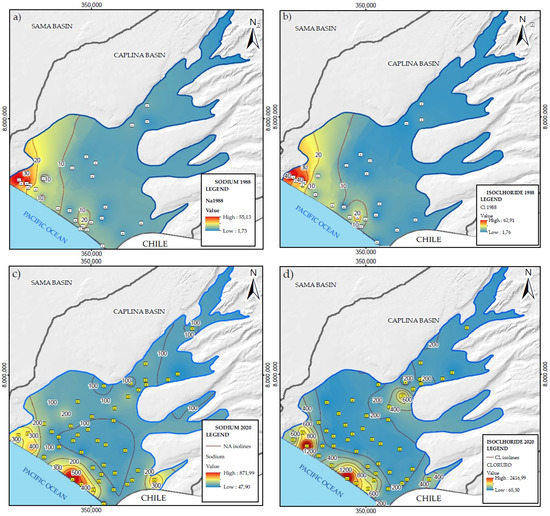 Iso-value plot in the groundwater of the La Yarada aquifer (this study) for 1988: (a) Na+, (b) Cl−, and for 2020: (c) Na+, (d) Cl−. The high concentration zones of Na+ and Cl− (i.e., seawater intrusion) have moved from W to SW along the sea-land boundary during the period.