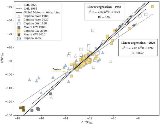 Distribution of δ18O and δ2H values of samples collected at the study area with the global meteoric water line (GMWL). The local meteoric water lines (LMWL) for 1988 and 2020 were plotted with respective equations. The isotopic values of Caplina and Maure Basin are on the trend line.