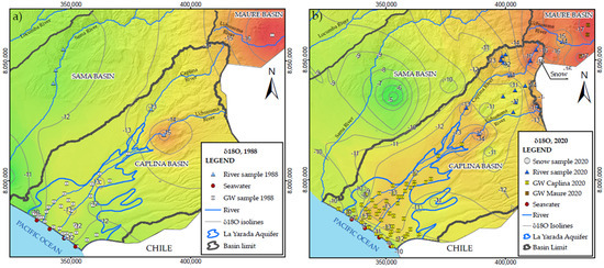 (a) Spatial distribution of δ18O in the Caplina, Sama, and Maure hydrological basins in 1988. (b) Update of the isotopic composition in the aquifer for the year 2020.