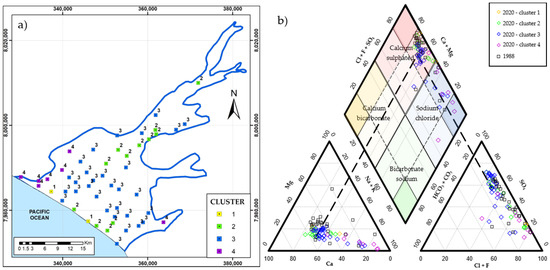 (a) Spatial distribution of four clusters, obtained from the grouping of 53 groundwaters sampled in 2020. (b) Piper diagram for samples from the years 2020 and 1988.