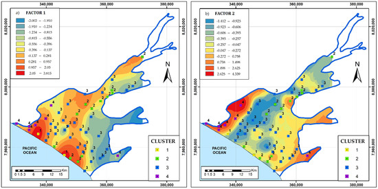 Spatial distribution of factors: (a) FA1 (seawater chemical front) and (b) FA2 (seawater isotopic front). The clusters were drawn from Figure 7 to compare the different multivariate approaches.