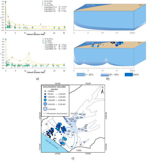 The extensive exploitation would drive this behavior at 11 km from the coastline that overlaps in the range of exploited volumes (Figure 9c). This anomaly maintains the isotopic signature in the aquifer (Figure 3) since exploitation is continuous every month of the year. Therefore, they do not allow the majority salinization of Cl− and Ca2+ in more than 30% of the aquifer. The graph of the γ fraction versus littoral distance (Figure 9a) appears to be a process called saltwater up-coning [43] as a result of the intense pumping of water in the area (Figure 9c).