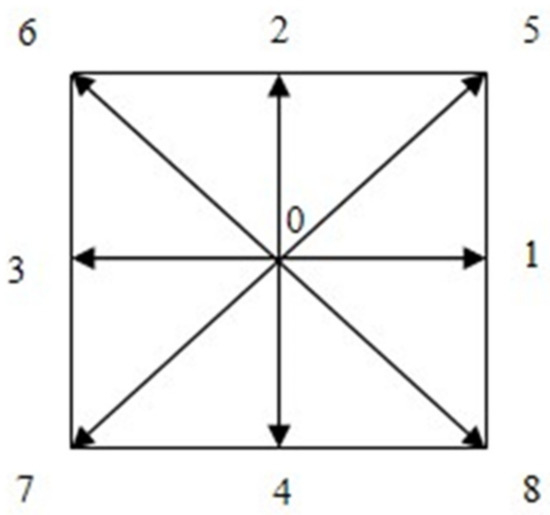 In the equation, is the particle distribution function in the direction of (in the D2Q9 model, , as shown in Figure 1), is the time step, represents the relaxed time, and the relationship between viscosity and relaxed time is: , is the equilibrium distribution function, defined as follows: