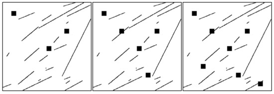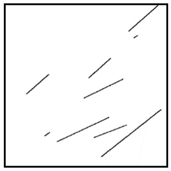 Step 2: the coordinates of midpoint (x, y) are generated randomly for each fracture, where , . In this study, the effect of dip angle is not considered. Therefore, the dip angle is fixed to a certain angle firstly, such as . Then, a small random perturbation is added to the dip angle, which is subject to in this case. The length of each fracture is generated by the function expand(x) in Matlab. It needs a mean length , which is set as . The aperture b is set as 1 for all fractures. Then, only the fracture part, which is located inside of the area, should be kept.