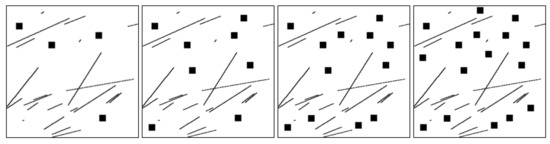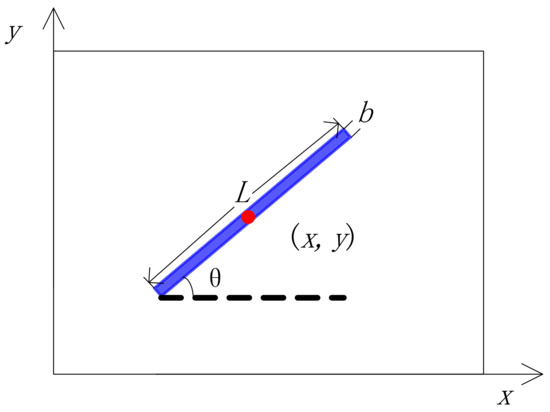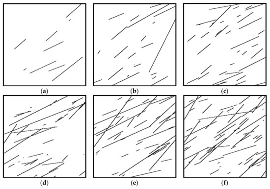 A series of fracture models, shown in Figure 2, are generated in this work. Four parameters are used to characterize the fracture, including the coordinates of midpoint (x, y), length l, dip angle , and fracture aperture b, which are shown in Figure 3. In the fracture model, the fracture density is adopted to describe the number of fractures in two-dimensional plane [34]. The fracture density is defined as: