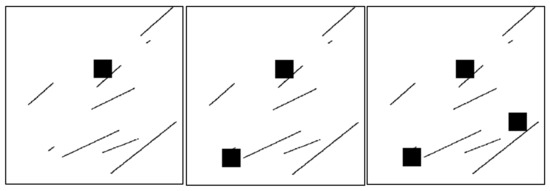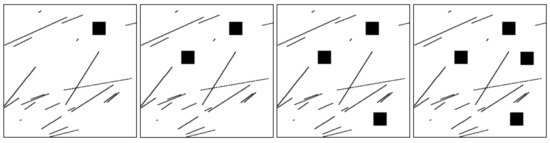 Two series of fracture models with different sizes and numbers of vugs are generated based on the physical model I. Only the fracture models with a density of 0.02 are chosen from the last section. The vugs are divided into two groups by its sizes, i.e., 100 × 100 for the bigger one and 50 × 50 for the smaller one. For the first group, one, two, three, and four big vugs are added to each fracture model, respectively, while four, eight, twelve, and sixteen small vugs are added in the second group, as shown in Figure 4 and Figure 5. For each fracture density in last section, five models are created. In the figure, only the first model with holes is given while in total there are 40 models.