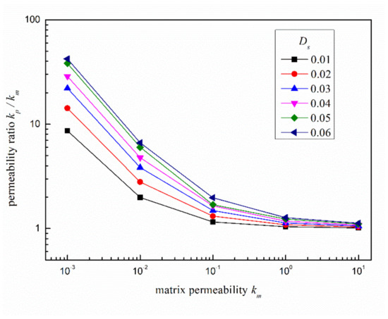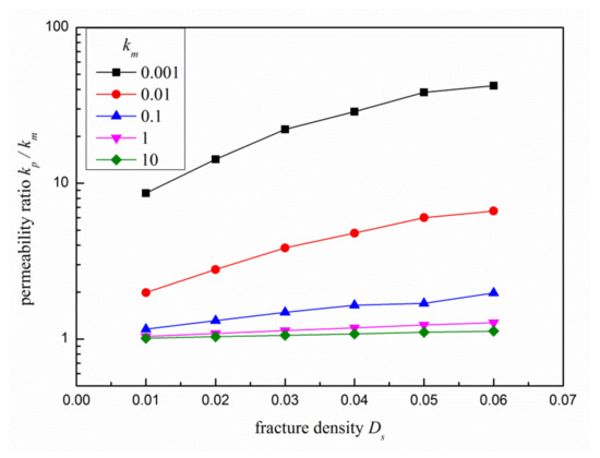 On the other side, the permeability ratio increases linearly as the fracture density increases with the same matrix permeability, as shown in Figure 10. This can be attributed to the fact that more fractures will bring more flow channels in the matrix system. It also can be seen that fractures have a more obvious influence on the lower permeability system.