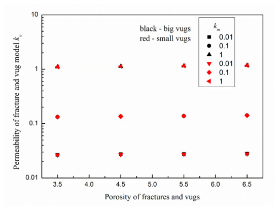 The influence of vug size is studied first. The permeability of the matrix system is 0.01, 0.1, and 1, respectively, while other parameters remain the same as the last section. In total, there are 120 examples. By simulation, the permeability of the whole system is calculated with the addition of fractures and vugs. The results of five examples are averaged, which have the same matrix permeability as well as the same vug number and size. The result is shown in Figure 11, in which the x-axis represents the porosity of fractures and vugs while the y-axis is the permeability of the model with fractures and vugs. By comparison, the permeabilities of fracture models with big vugs and small vugs are almost the same, and no obvious differences can be observed. It can be inferred that the size of vugs has no direct relations with the improvement of permeabilities. It thus means the influences of fractures and vugs on fluid flow are different. The interconnected fracture network can improve the flowing ability of the reservoir greatly, while the vugs and disconnected fractures can only increase the fluid reservoir space with no contribution to the flowing. To further verify this conclusion, a set of new models are built for flow simulation.