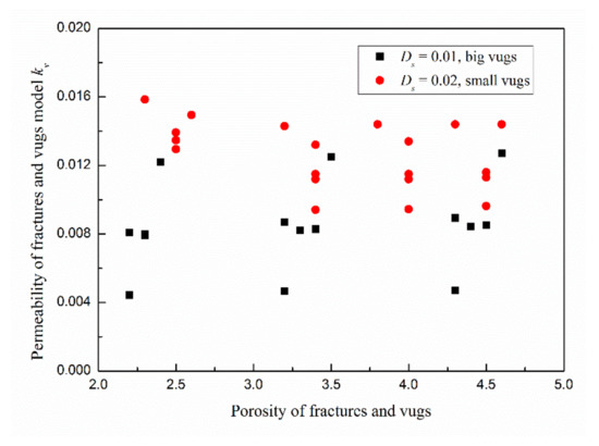 In this section, the physical model III was used to simulate. The permeability of the matrix system in the simulation is 0.001, while other parameters remain the same as last section. In total, there are 30 examples. The permeability of the whole system with fractures and vugs is calculated and the result is shown in Figure 12. The x-axis represents the porosity of fractures and vugs while the y-axis is the permeability of the model with fractures and vugs. In the same porosity, the permeability of small vugs is generally higher than that of large vugs, because the connectivity between larger vugs and fractures is generally smaller than that between narrow vugs and fractures. The larger vugs corresponds to a stronger heterogeneity, which can be seen as the aggregation of small vugs in one place, while the model with small vugs has a stronger homogeneity, more dispersed vugs, and better connectivity with fractures.