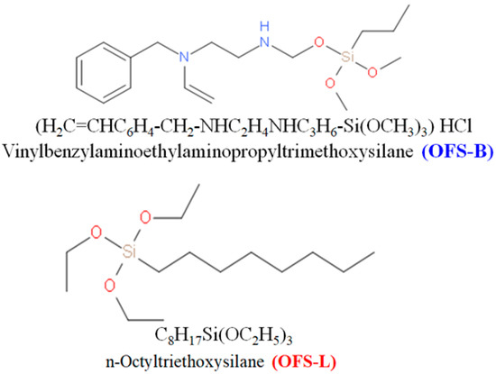 Silane modified clay and soil were prepared as in previous work by Shah et al. [27,29] and Gupta et al. [28]. In short, the organoclays/soils were synthesized in the laboratory by condensing clay and soil particles with an aqueous silane material solution (OFS-B and OFS-L) (see Figure 1). The organic silane was dispersed in water at a ratio of 1:10 (silane (ml): water (ml)). Clay and soil were added to disperse silane materials and allowed to react for 45 min at 40 °C, followed by pH adjustment to 3–4 with HCl and constant stirring for 30 min. The reaction was cooled and stirred for an additional 3 h to homogenize it. Finally, after allowing the modified samples to sit for 10 h at room temperature, the supernatant slurry was decanted into separate vessels. The remaining slurry was centrifuged at 2000 rpm for 10 min, and the sediment was dried in an oven at 80 °C overnight. The bioretention system was built from the silane-modified clay and soil obtained.