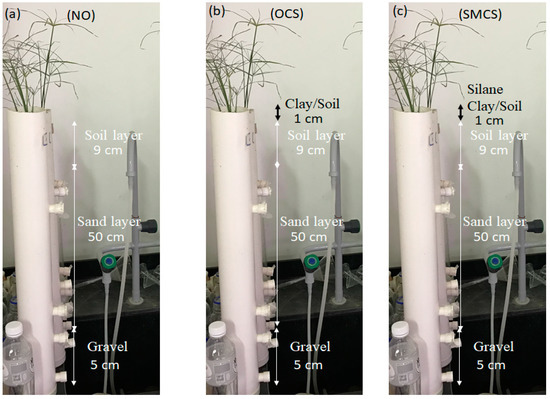 After calculating the water, three systems were installed (see Figure 2), one without an additional layer (Figure 2a), one with untreated clay and soil (Figure 2b), and one with a silane-modified clay and soil incorporated system (Figure 2c). After all the systems were installed, the test columns were rinsed with tap water (each test column was reported by 2 L at a time, twice a day, for 4 days) to allow the water to flow from the top down in the test column and between the layers. After the scour was complete, the bio-retention column was flushed with simulated rainwater (three times a day) to obtain saturation.
