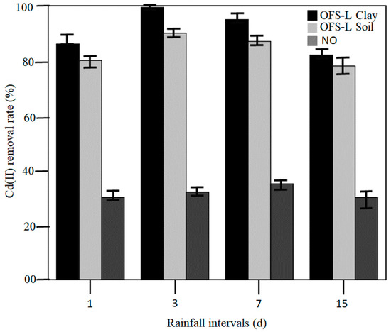 Figure 3 shows the Cd (II) removal rate in the bioretention system utilizing OFS-L modified clay and soil samples over rainfall intervals. NO represents a typical bioretention system without adding any clay or soil. The clearance rate of Cd (II) increased at first and then declined after 7 days, as seen in the graph. On the third day, the removal rate of Cd (II) by OFS-L modified clay reached a maximum of 98.3%, then stabilized at above 80% in the samples. The OFS-L modified soil displayed the second highest adsorption on the third day. Meanwhile, the removal rate for bioretention systems with no extra layer, i.e., NO, was the lowest. Furthermore, the removal rate of NO samples remained nearly constant when compared to the other two types of systems. The reason for this is that the OFS-L modified clay and soil system has a larger interlayer spacing, implying more interaction space. For the same reason, clay and soil samples are analyzed. Clay has a comparatively larger layer space than soil. The reason for the increased amount of removal for day 3 is the occupation of available free sites. Bioretention systems were dried on the first day but were wet on the third day due to rain. Swelling may be visible in different samples throughout this time. This swelling allows Cd (II) to be removed from the clay [27]. The binding sites for the Cd (II) in soil are provided by the arrangement of modifiers on surfaces.